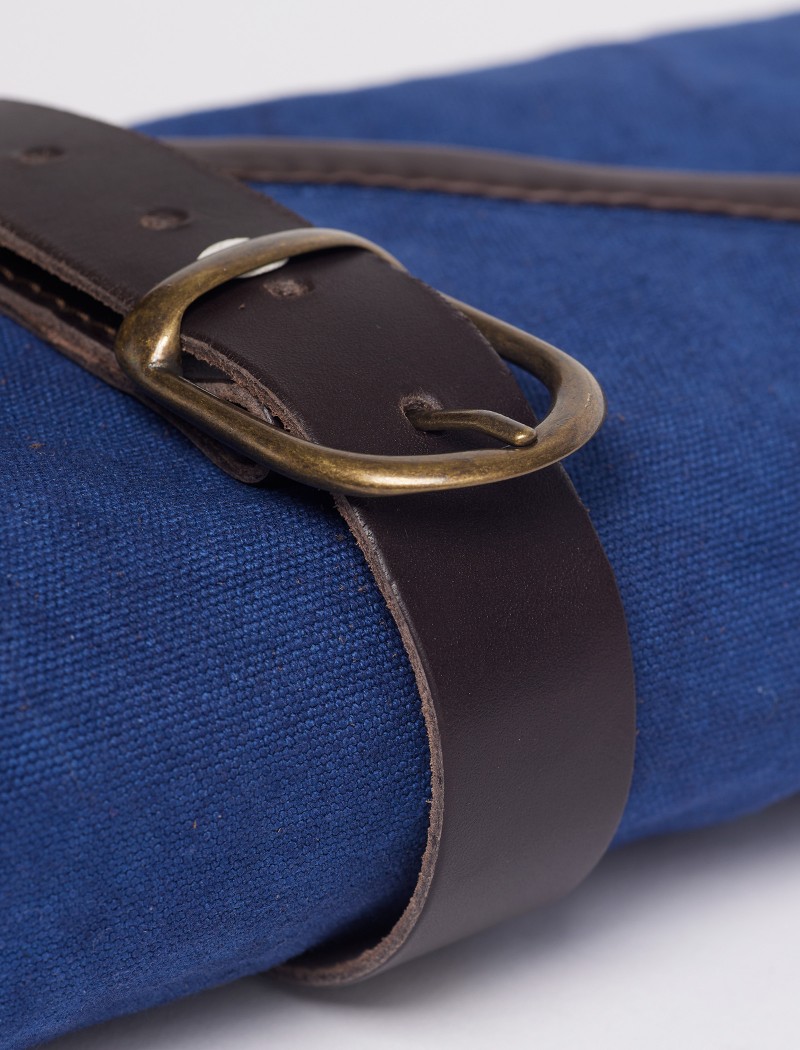 Bolsa para cuchillos azul fabricada para profesionales de la cocina. Diseñada para guardarse enrollada y con capacidad de 6 cuchillos. Su cierre con correa de cuero y su solapa interior doble en canvas y piel serraje, proporcionan una mayor seguridad y mantienen tus cuchillos y herramientas a salvo.
